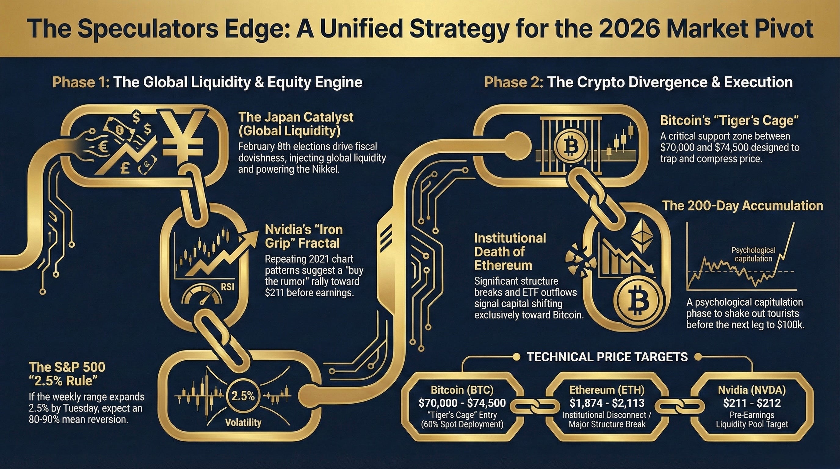 Proprietary analysis identifies Bitcoin’s $70,000–$74,500 zone as a high-timeframe fair-value gap sitting directly on the 2021 all-time high—creating the “tiger’s cage” where price compresses before reversal. Historical six-month candle data shows Bitcoin rarely sustains more than five consecutive bullish candles; we are now in the second bearish candle, implying a time-bound correction rather than a multi-year winter. The recommended tactic: wait for a sweep below $74,500, then deploy 50% spot capital targeting $100,000+. Ethereum, by contrast, has broken quarterly support with negligible ETF inflows, pointing to downside targets near $1,300–$1,360. NVIDIA remains underweight relative to earnings and is expected to rally into February 25 earnings before any sell-the-news drop. The S&P 500’s 2.5% weekly expansion rule offers an 80–90% edge for fading early-week strength. Silver’s monthly RSI nearing 98 signals extreme leverage that could trigger a 40% washout.