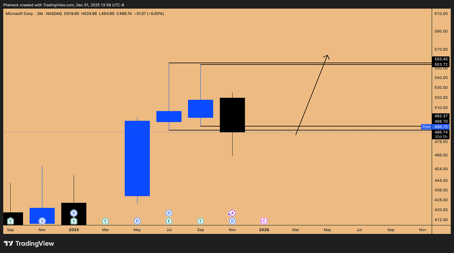 Microsoft just closed the monthly candle as an SFP, reclaiming the lows of the inside two-month candle. It also tapped the 468 support (previous cycle high). This reeks of a short squeeze that will take out all-time highs and drag the NASDAQ with it. Expect capital rotation from overextended names (like Google, which has 8 consecutive green months) into Microsoft.