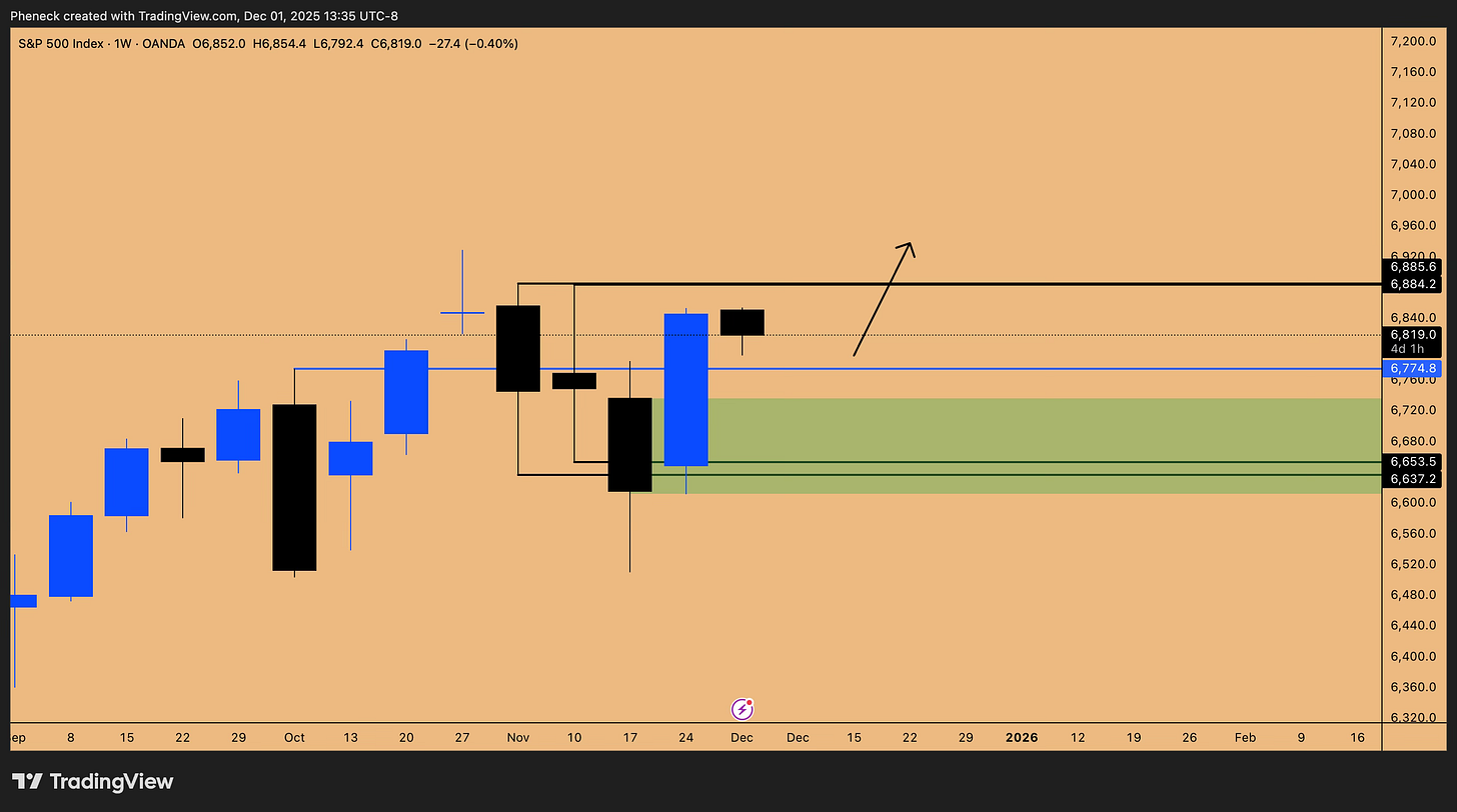 Looking ahead to the first quarter of 2026 (January, February, March), this current quarter’s low—which was put in last week—serves as the reference point. To maintain a sustainable bull trend entering 2026, the market must not breach the previous quarter’s low. Therefore, the 6503 quarterly low is critical. If we see a pullback after making new highs, the re-entry for longs going into 2026 will be at the 6774 support level.