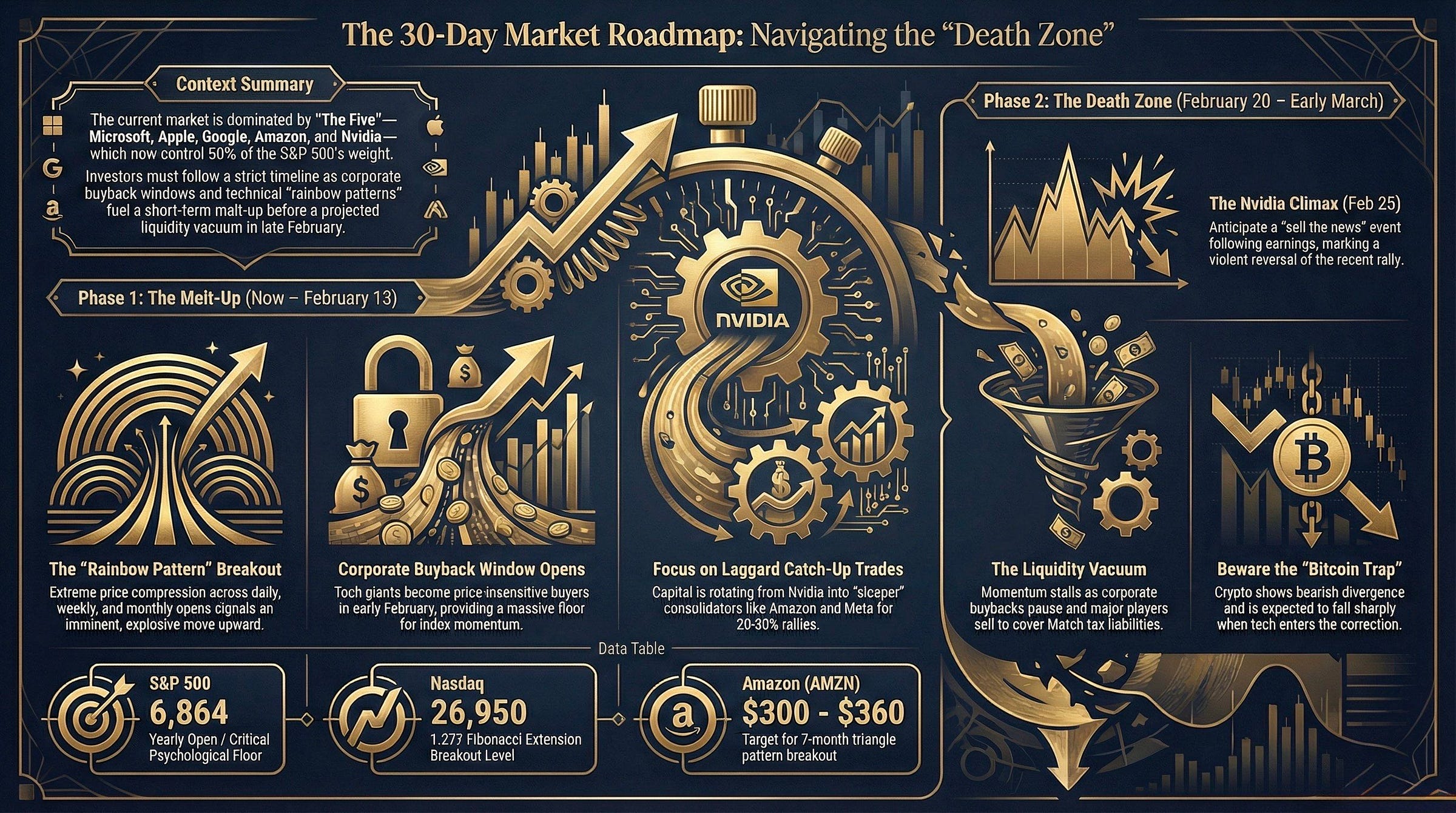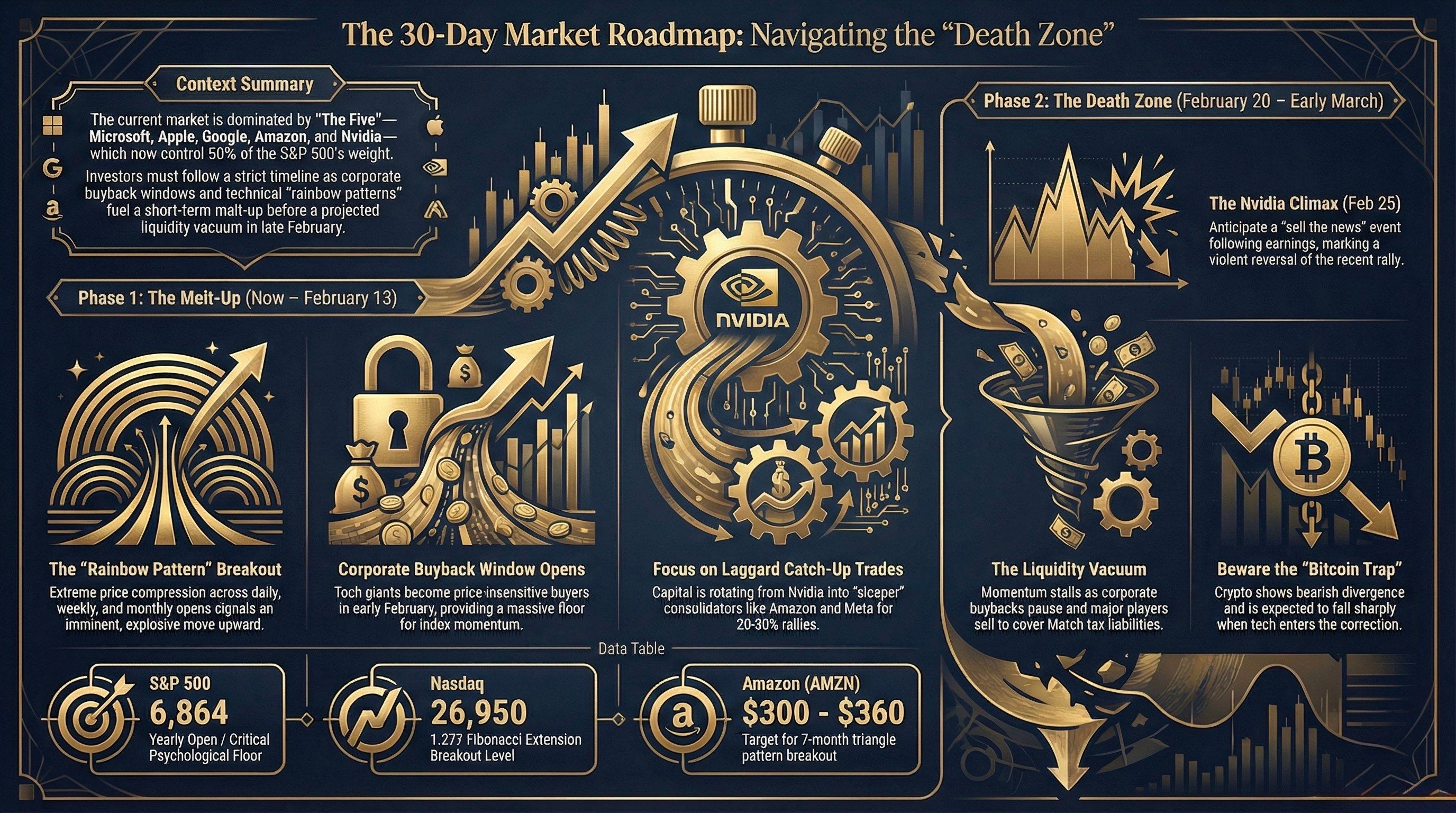 The podcast’s core draws from proprietary research highlighting concentration risks: the top five stocks now comprise 50% of the S&P 500’s weight, rendering the rest as “noise.” Trading insights include Fibonacci extensions targeting Nasdaq at 26,950, Amazon’s coiled triangle poised for 20-30% rallies to $300-$360, and Meta’s rotation potential to $788 highs. Warnings abound on NVIDIA’s earnings as a sell-the-news event around February 25th, with liquidity neutralization from exhausted buybacks and tax liabilities creating a risk-off period post-February 13th. Crypto specifics feature Bitcoin’s chop zone at 80K-90K, eyeing drawdowns to $74,508, and Ethereum shorts from $3,477 targeting $2,628, emphasizing relative weakness amid tech’s surge.