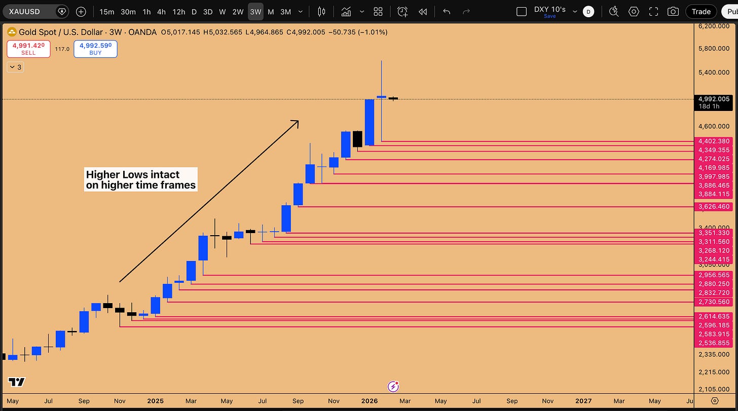 Gold’s recent price action is nothing short of extraordinary and frankly, mind-boggling. Despite sitting at deeply overbought levels on virtually every momentum indicator, the metal stubbornly refuses to break its bullish structure. This is a phenomenon that speaks to the sheer force of institutional demand flowing into the safe-haven asset, and it should command the attention of every serious portfolio manager. The breakout originated from a double inside bar pattern on the higher timeframes, a consolidation structure that compressed price energy like a coiled spring before releasing it into a pure expansion mode with no signs of exhaustion anywhere on the chart.
