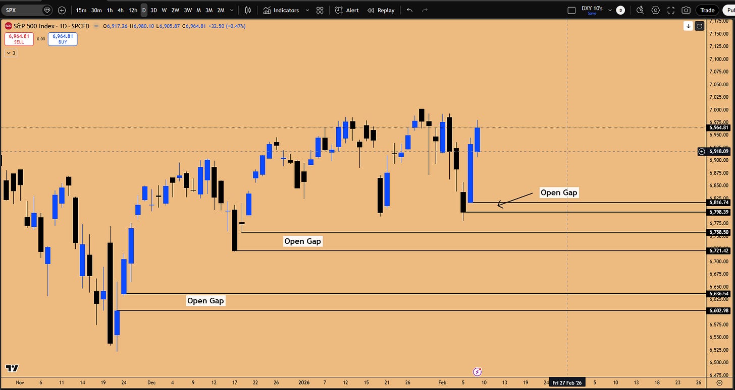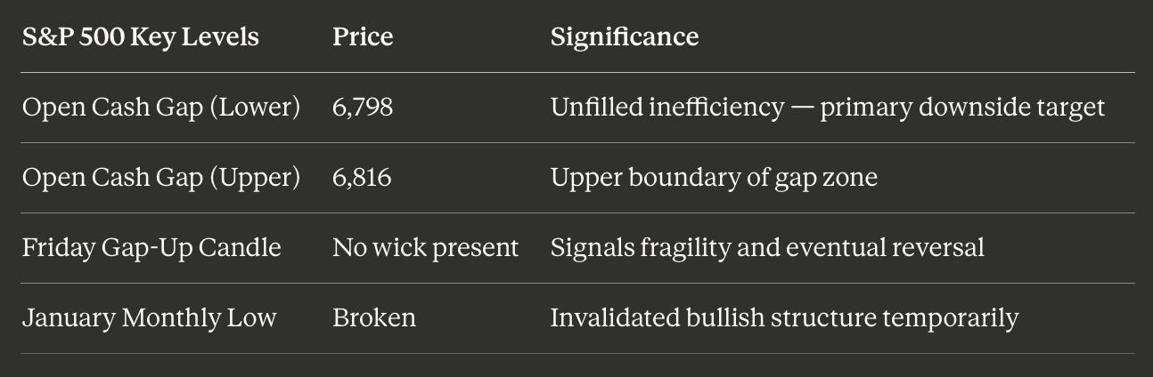 Friday’s price action in the S&P 500 delivered one of those moments that separates disciplined analysts from reactive traders. Nvidia’s explosive 7% rally dragged the index higher in a dramatic U-turn reversal, without ever filling the open gap on the cash index. That gap, sitting between 6,798 and 6,816, remains conspicuously open. And the nature of the gap-up candle on Friday is telling: there is no wick present, meaning the squeeze that propelled the market higher left behind a significant inefficiency.