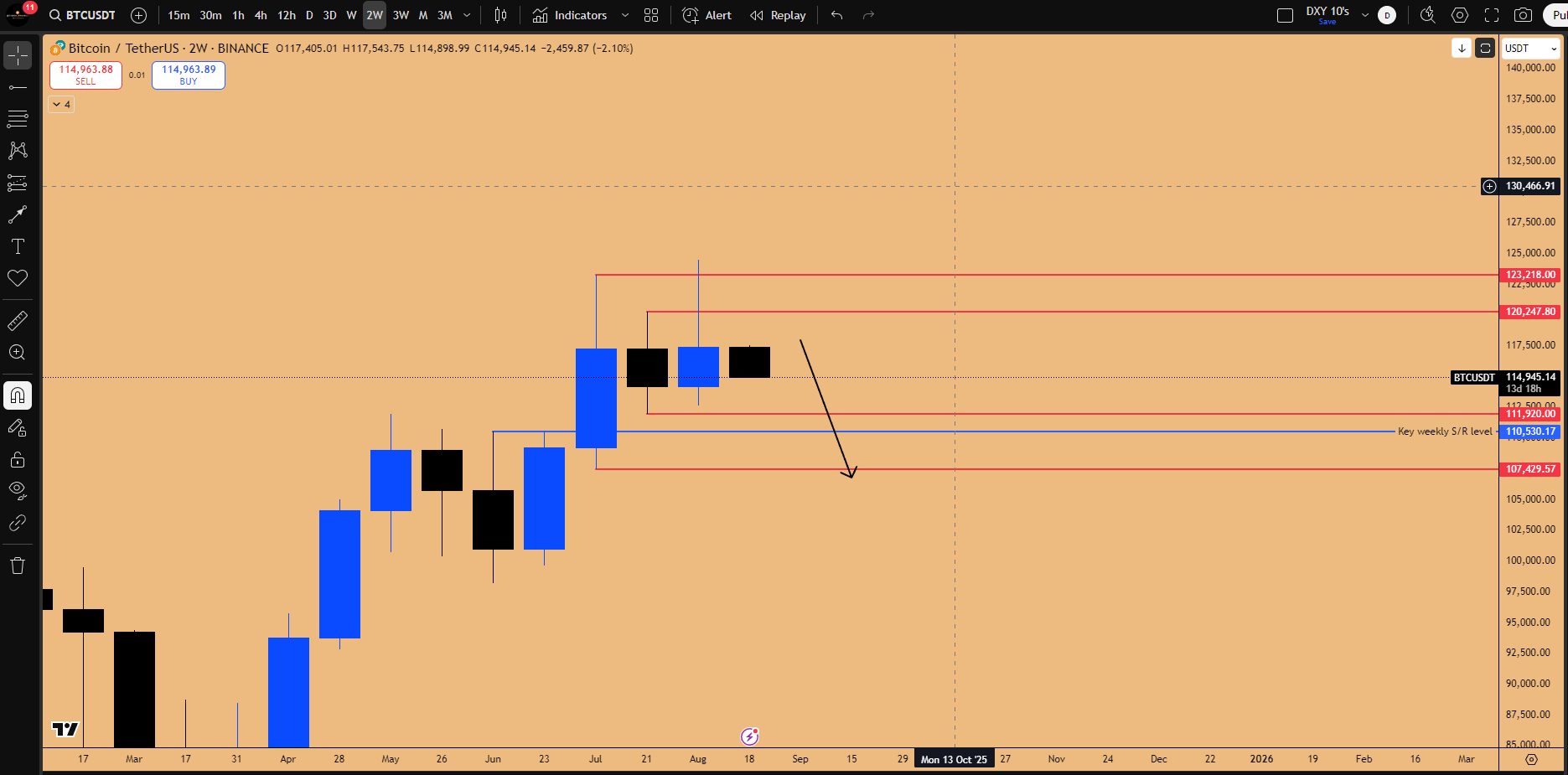 Invalidation Level: The bearish thesis is invalidated only if the next 2-week candle turns bullish and closes above the $123,225 high.