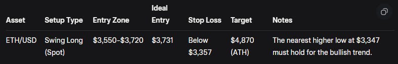 The macro range analysis supports this entry. Price recently rejected the 25% range level ($3,870), tagged the midpoint of the sub-range ($3,377), and rallied toward the all-time high. Since the highs have not been stopped out (swept), any pullback to $3,870 is a long opportunity.
