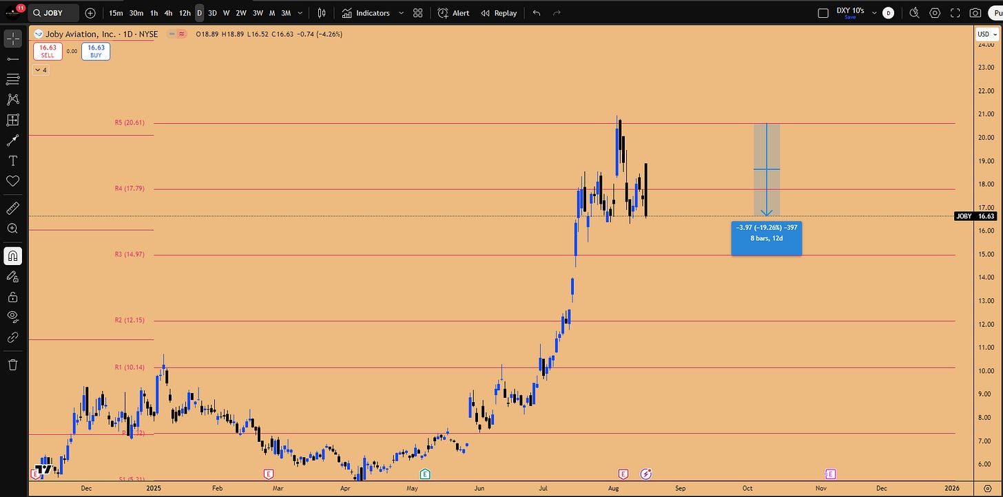 Example: Joby Aviation (JOBY): Following a macro triangle breakout, JOBY rallied almost 192%. It topped out precisely at the R5 Yearly Pivot, tagging it to the exact cent before rejecting heavily. This indicates the extension for the year is likely complete.