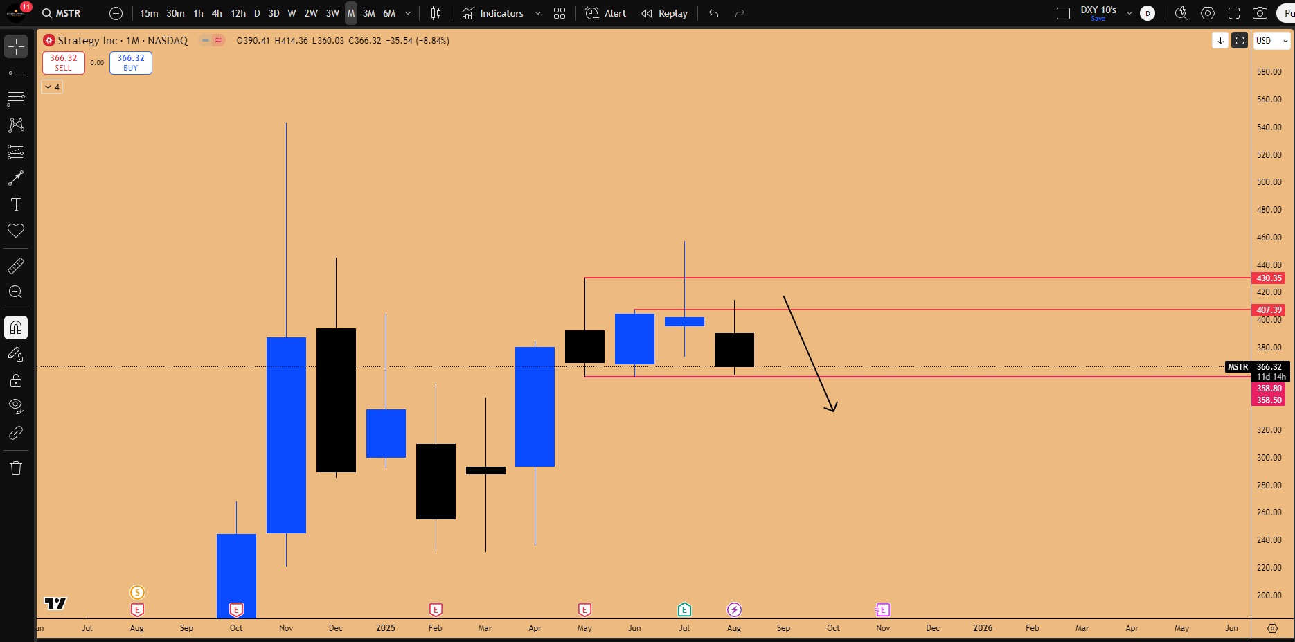 In July 2025, MSTR saw a fakeout to the upside and closed as a Swing Failure Pattern (SFP). on the monthly chart, suggesting downside price action to unfold.
