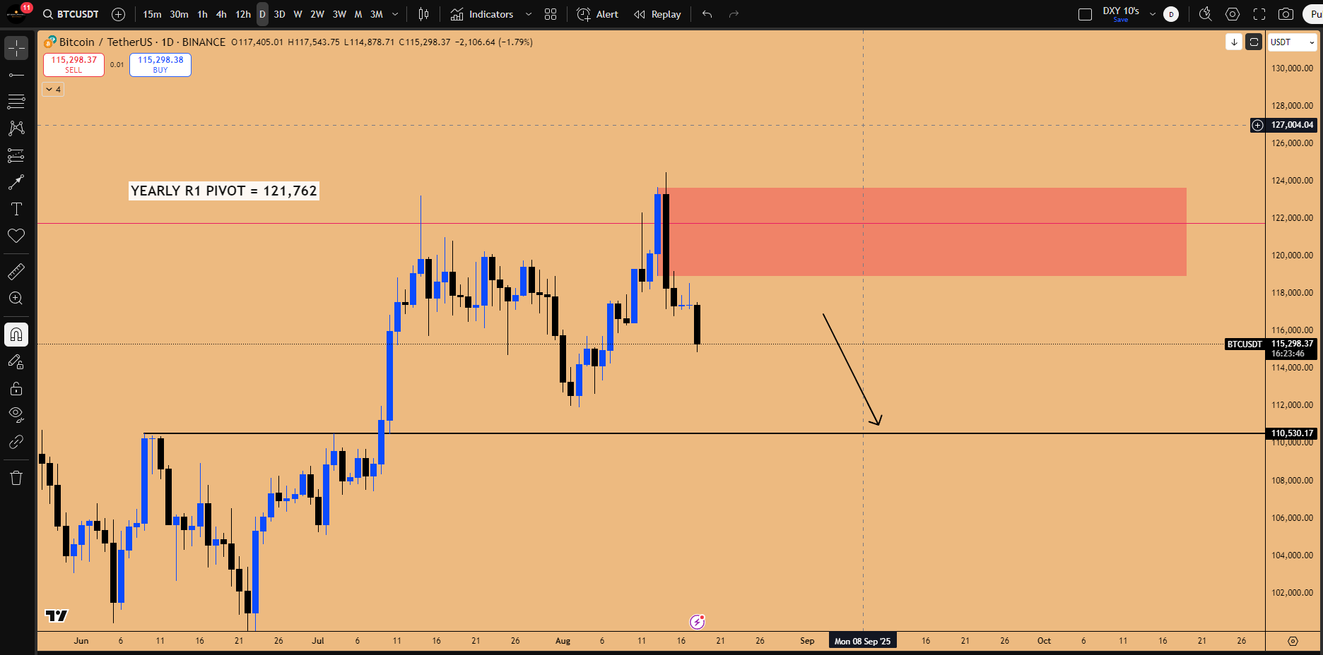 The current market landscape is defined by clear signals of exhaustion and potential topping patterns, particularly in Bitcoin and its proxy, MicroStrategy. The parallel to the March 2021 top, characterized by bearish divergences and inside candle failures, combined with the rejection at the R1 Yearly Pivot ($121,767), demands a defensive posture.