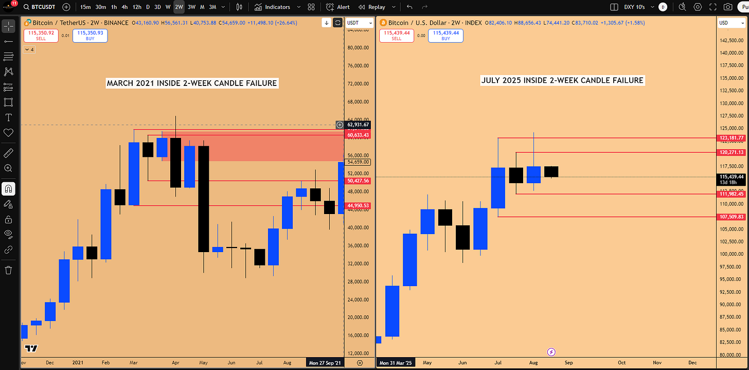 Figure 1: March 2021 Inside 2-week Candle Failure vs July 2025 Inside 2-week Candle Failure