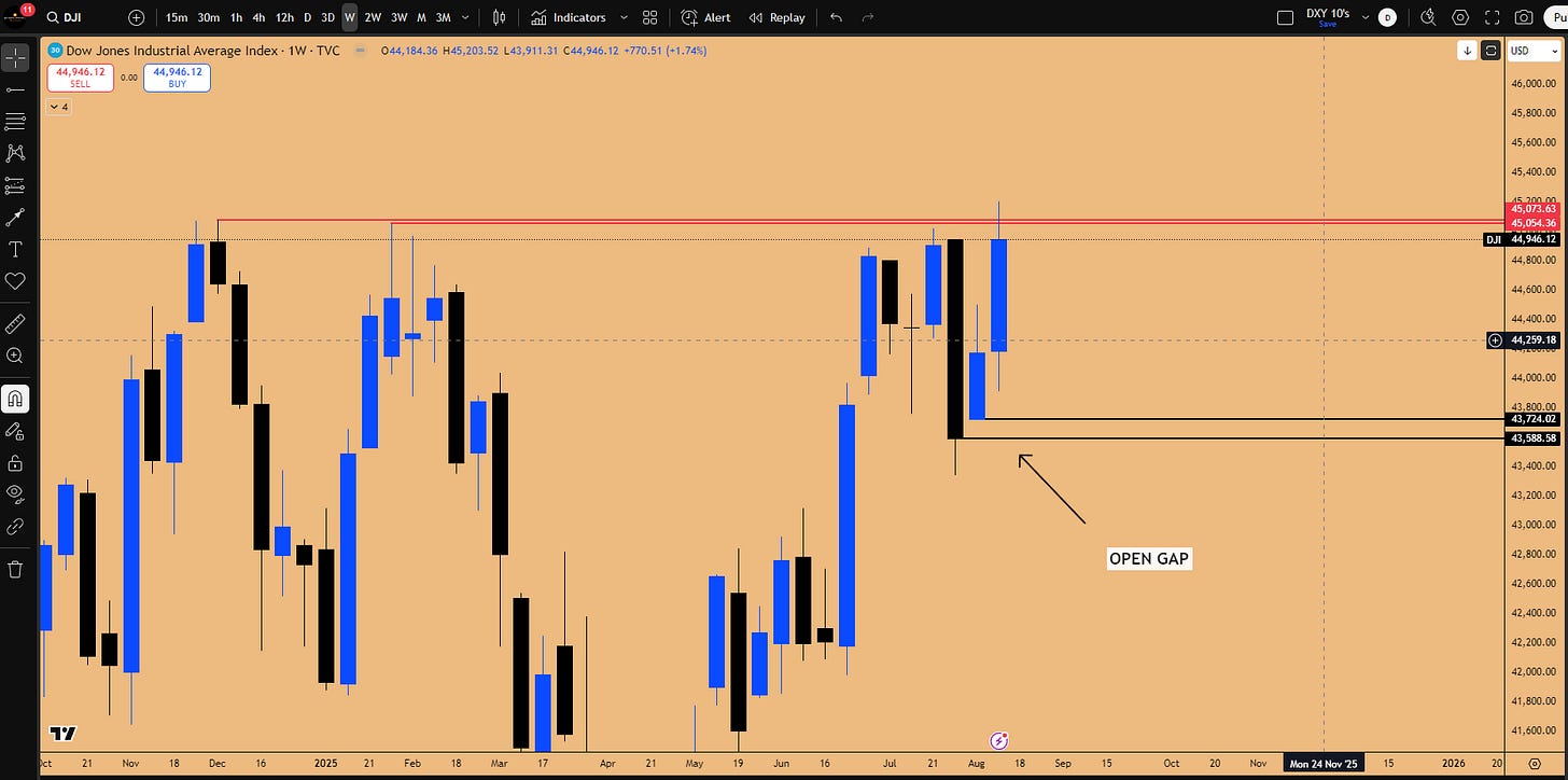 A major inefficiency exists on the DJI 3-week chart: an open gap between 43,588 and 43,724.