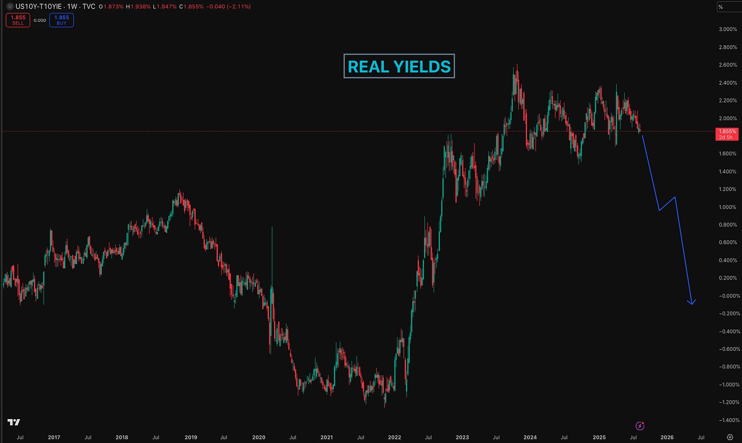 The core of the long-term thesis is that the US government will eventually run negative real yields. Real yield is the return you get on a US Treasury bond after stripping out the inflation component. If real yields are negative, it means that by holding this bond for its entire term, you are guaranteed to lose purchasing power. This isn't unprecedented; we saw this happen from the COVID period all the way until May 2022. While common in Japan, it was a relatively new phenomenon for the US.