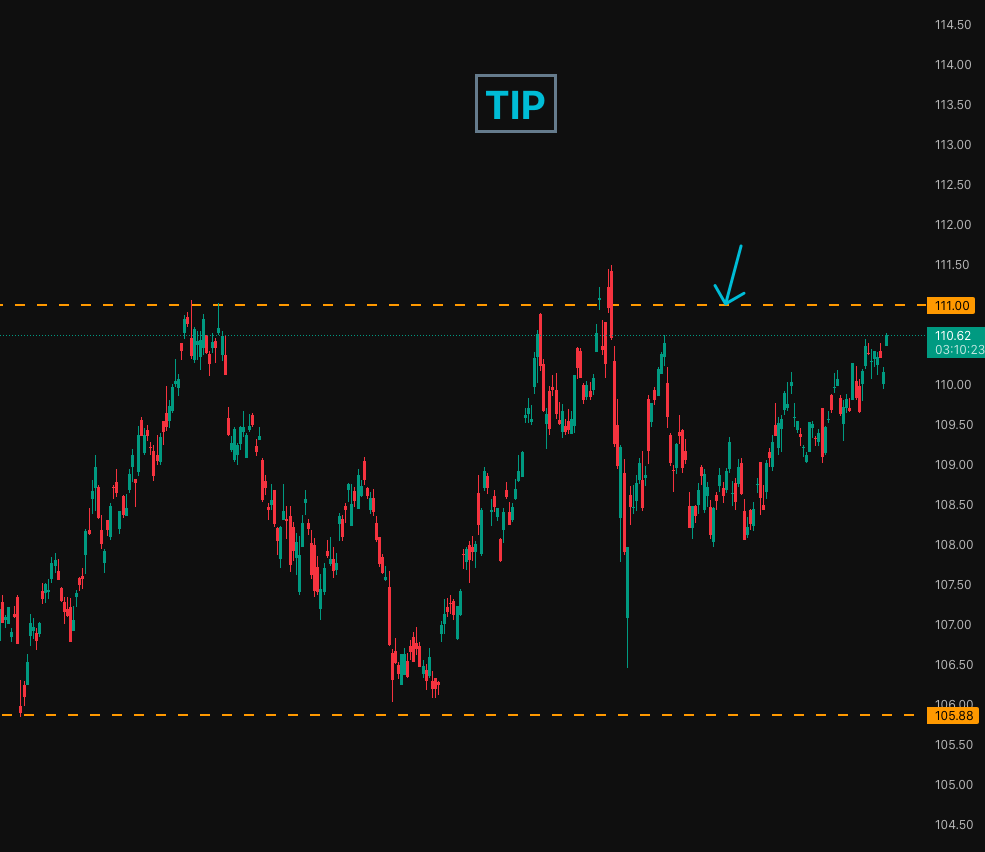 Here is a curveball that every trader needs to have on their radar. TIPS (Treasury Inflation-Protected Securities) are inversely correlated with real yields. When TIPS go up, real yields go down. I am watching the 111 level on the TIPS chart (currently trading at 110.16).