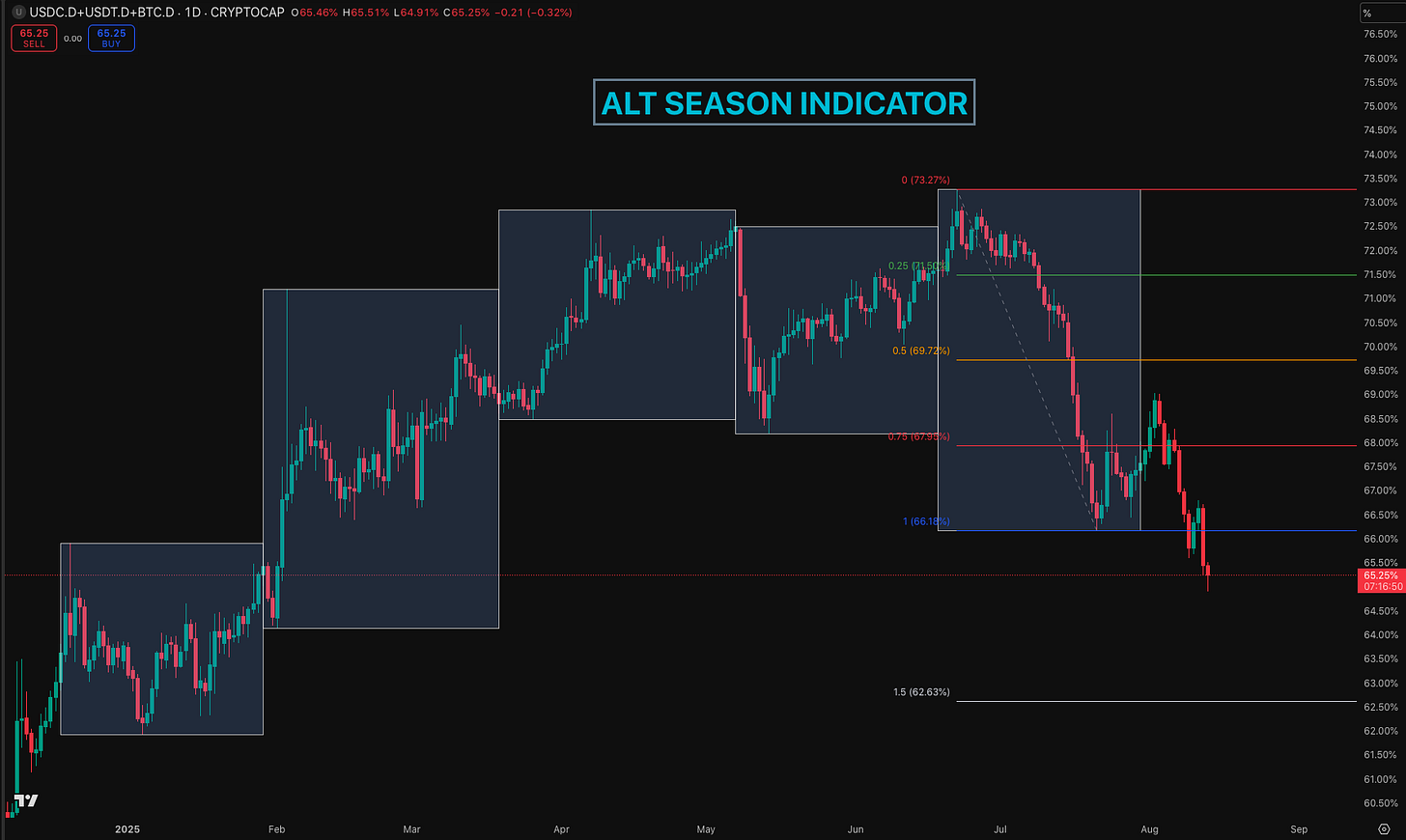 The crypto market is telling a fascinating story. Our synthesized altcoin indicator, which is composed of stablecoin dominance plus Bitcoin dominance and moves in inverse correlation to altcoins, has provided a powerful signal. We were watching for a break of the 66% level, and as soon as it gave way, it triggered a fast elevator move down for the indicator. This was the starting gun for a powerful rally in altcoins.