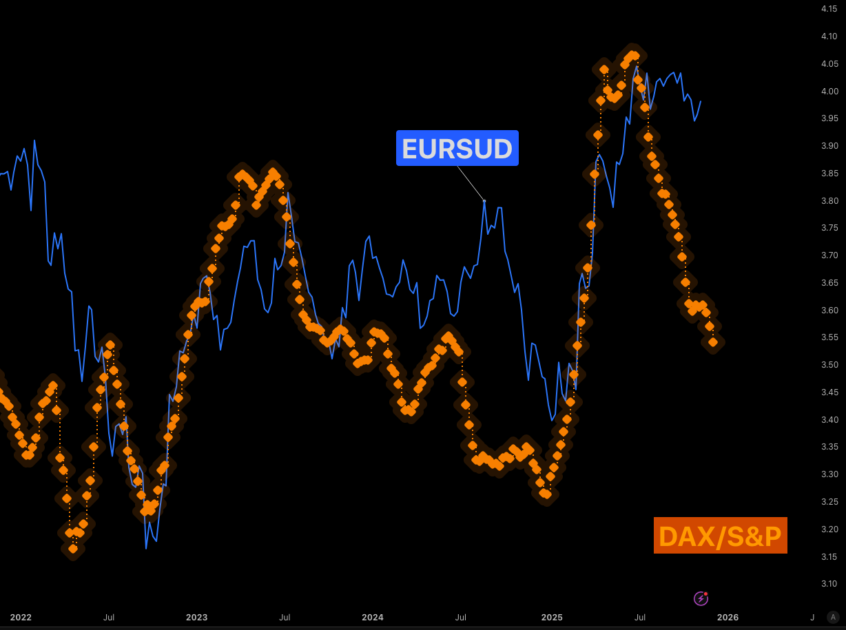 The core of our analysis begins with a unique “crystal ball” chart an anomalous correlation between the DAX ETF / S&P 500 ETF ratio (offset by ~25 days) and EURUSD. This indicator, which has held for 16 quarters, is currently signaling a potential dip for EURUSD as we head into the end of November. While macro reasons are scarce, this flow-based indicator has proven remarkably prescient, especially around quarter-ends.