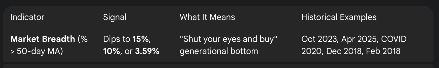 This is perhaps the most powerful bottom-catching indicator we have. It measures the percentage of stocks trading above their 50-day moving average.