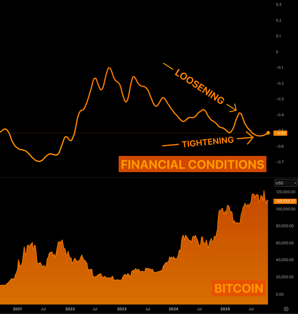 Why the bearish bias? Because of the Financial Condition Index (FCI). This is a massive, lagging indicator that accounts for ~105 different assets (bonds, yields, dollars, flows, etc.) to measure credit availability.