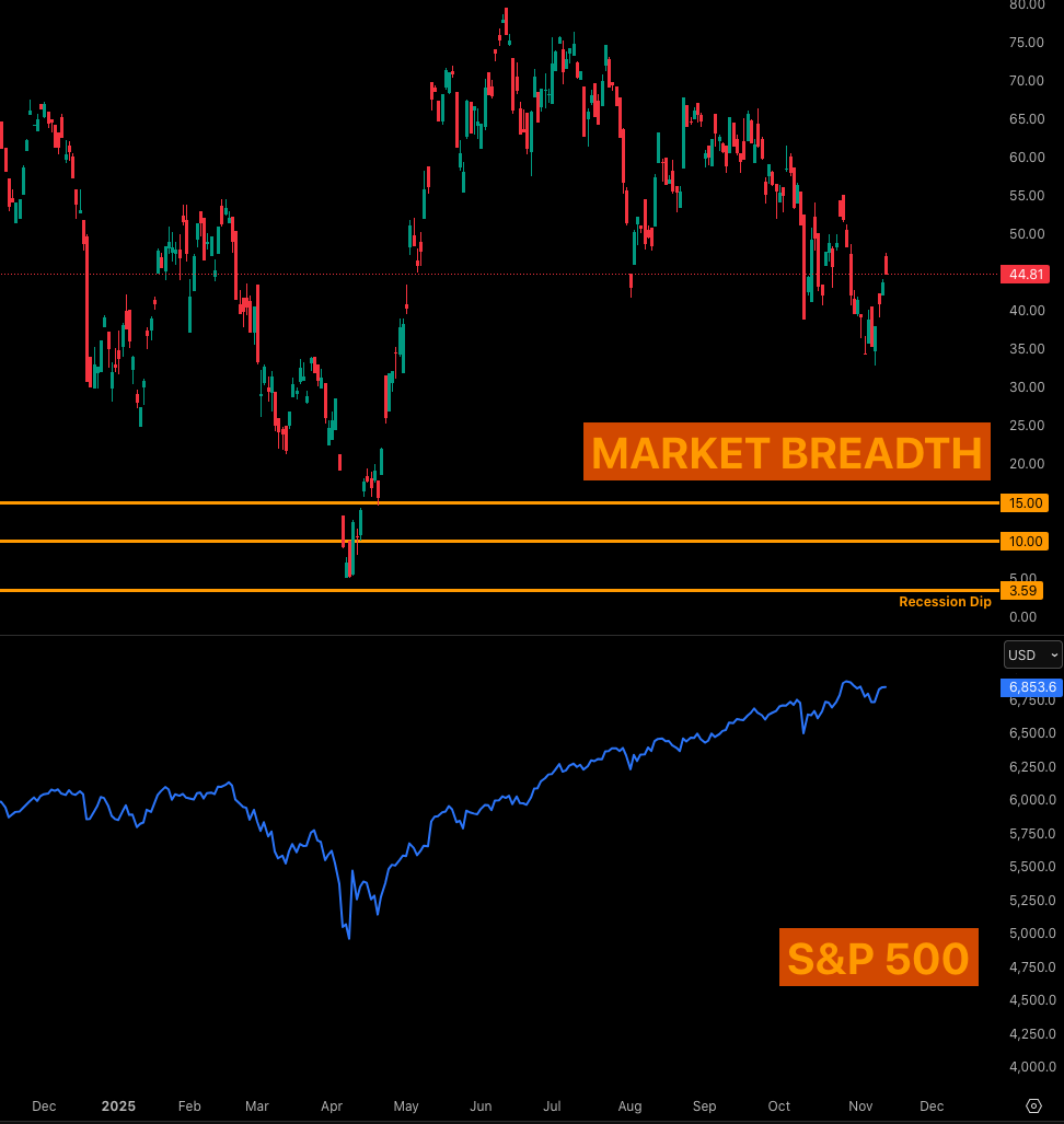 Market Breadth (% > 50-day MA): Our “shut your eyes and buy” indicator. It’s currently weak, with the market held up by the Magnificent 7. But if it dips to its key low zones (15%, 10%, or 3.59%), it has historically marked generational bottoms (COVID, Oct 2023, Dec 2018 and GFC).
