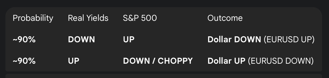 Scenario 1: Real Yields DOWN + S&P 500 UP = Dollar DOWN (EURUSD UP).