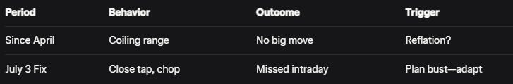 Gold expectation: Hit abandoned fix, bounce, climb. It literally never hit it. Came close July 3, tapped briefly, busted through too choppy. This is not what we had planned. No intraday trades; held six-week longs but cut structurally at range top. Not long anymore, despite building market anxiety. Gold has not been going anywhere since April. Coiling for big move need research on reflation ties. July 10 load-up to range top, disappointing.