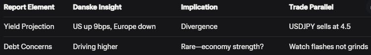 Strategies: Read bank reports (e.g., Danske yield outlook), remember agendas narratives sound good, but nuggets in between/what not said. No AI summaries engage personally, history/price reaction key. Example: Danske hinges on trade deal, projects US yields up 9bps in 12 months (4.41 to 4.50), Europe down divergence. Debt concerns rare as grind (flash like Liz Truss), more economy strength. QRA borrowing $400B for TGA $850B sucks $300-330B liquidity Q3, dampens equities via margin debt.