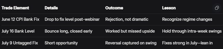 By July 16 the bank level bounce idea executed perfectly: went long earlier, closed on pullback, reloaded, but major long waited until Monday. The level worked, boosting confidence in fixes. Another untagged fix on July 9 led to shorts: it went up and down, reversed, captured on swing basis but not intraday. Textbook example, as we would say. Fixes "very strong" in July, e.g., flagging levels for "picture perfect" drops.